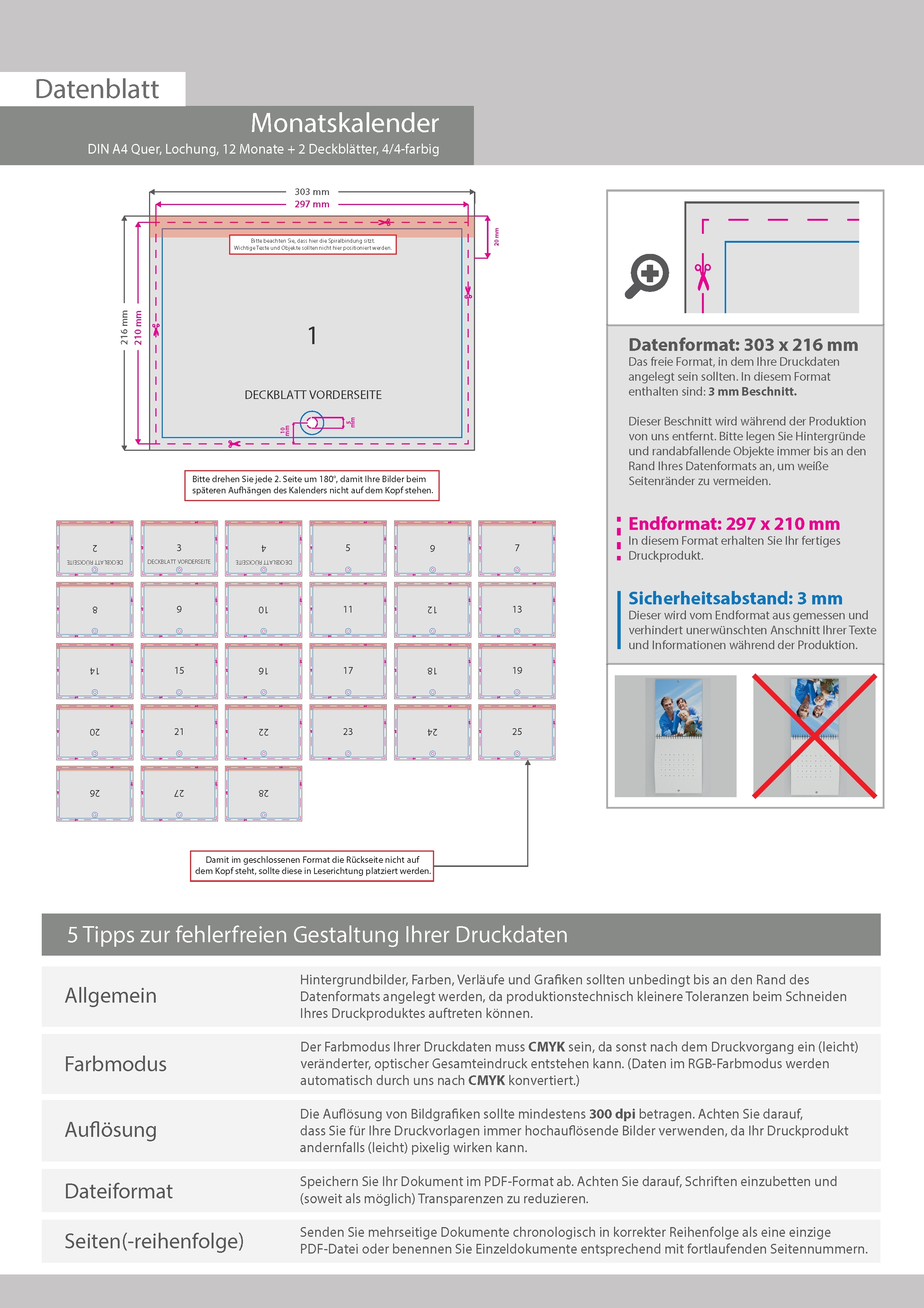 Monatskalender mit Lochung 14 Blatt (12 Monate + 2 Deckblätter)